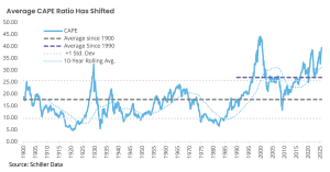 Valuations are high, but perhaps not as abnormal as investors fear. Market historians point to today’s cyclically adjusted price-to-earnings ratio (CAPE ratio—a measure of valuation that smooths out the temporary effects of economic cycles and short-term earnings volatility), which is at nearly 40x compared to a long-term average of about 18x since 1900.
